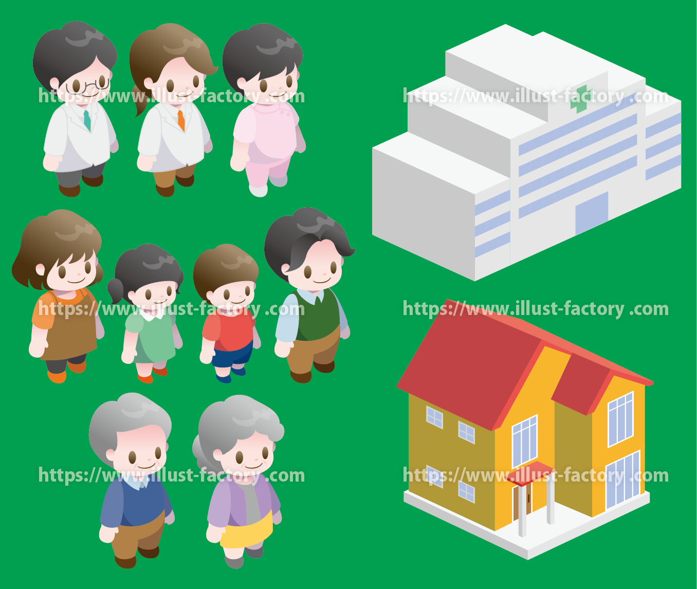 アイソメトリックな人物イラストを制作例です。可愛らしく優しい雰囲気のタッチに、明るくハッキリとした見やすいカラーで仕上げました。 医療関係の冊子やチラシ等の紙媒体のワンポイントの挿絵や表紙、学校やお子様向けの教材、生活に寄り添うようなテーマにピッタリのタッチとなっております。またシンプルで動かしやすいイラストの造りとなっておりますので、簡単な動画やアニメーションなどにもおすすめです。 今回、家族と医師をメインに制作しておりますが、医療関係に限らず、季節や風景、シチュエーション等、ご要望に合わせて幅広く制作可能です。ポーズや、小物、服装や背景、テキストや色味など、紙面や制作したい物の雰囲気に合わせて、柔軟に制作、変更可能ですので、是非お気軽にご相談くださいませ。
