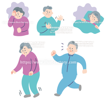 高齢者の体の不調、健康状態についてのイラストです。 高齢者に多い疾患で現れる、手の震えや筋肉のこわばりなどの運動機能障害、疲労感や抑うつ、不眠など、さらには投薬や運動によって改善する様子を温かみのある柔らかなタッチで制作いたしました。医療関係や介護関連、高齢者施設等の挿絵におすすめです。