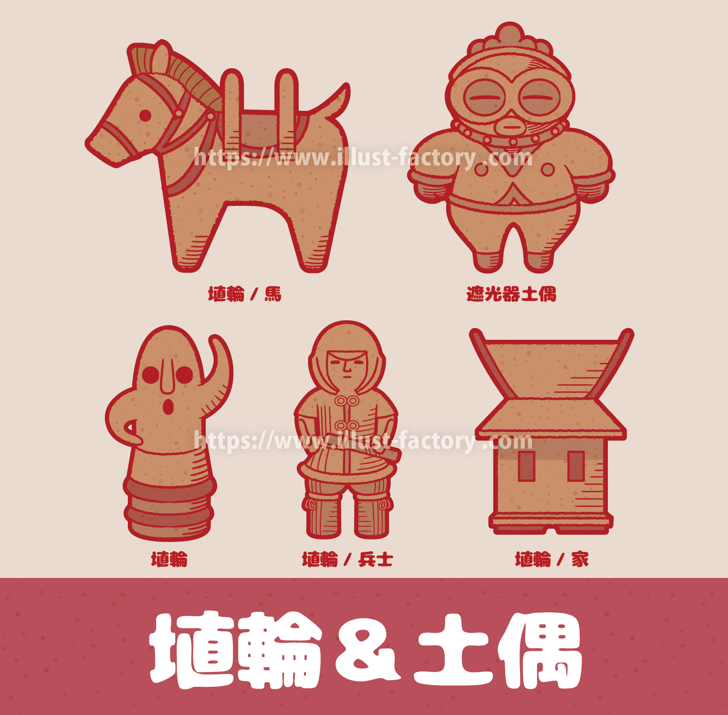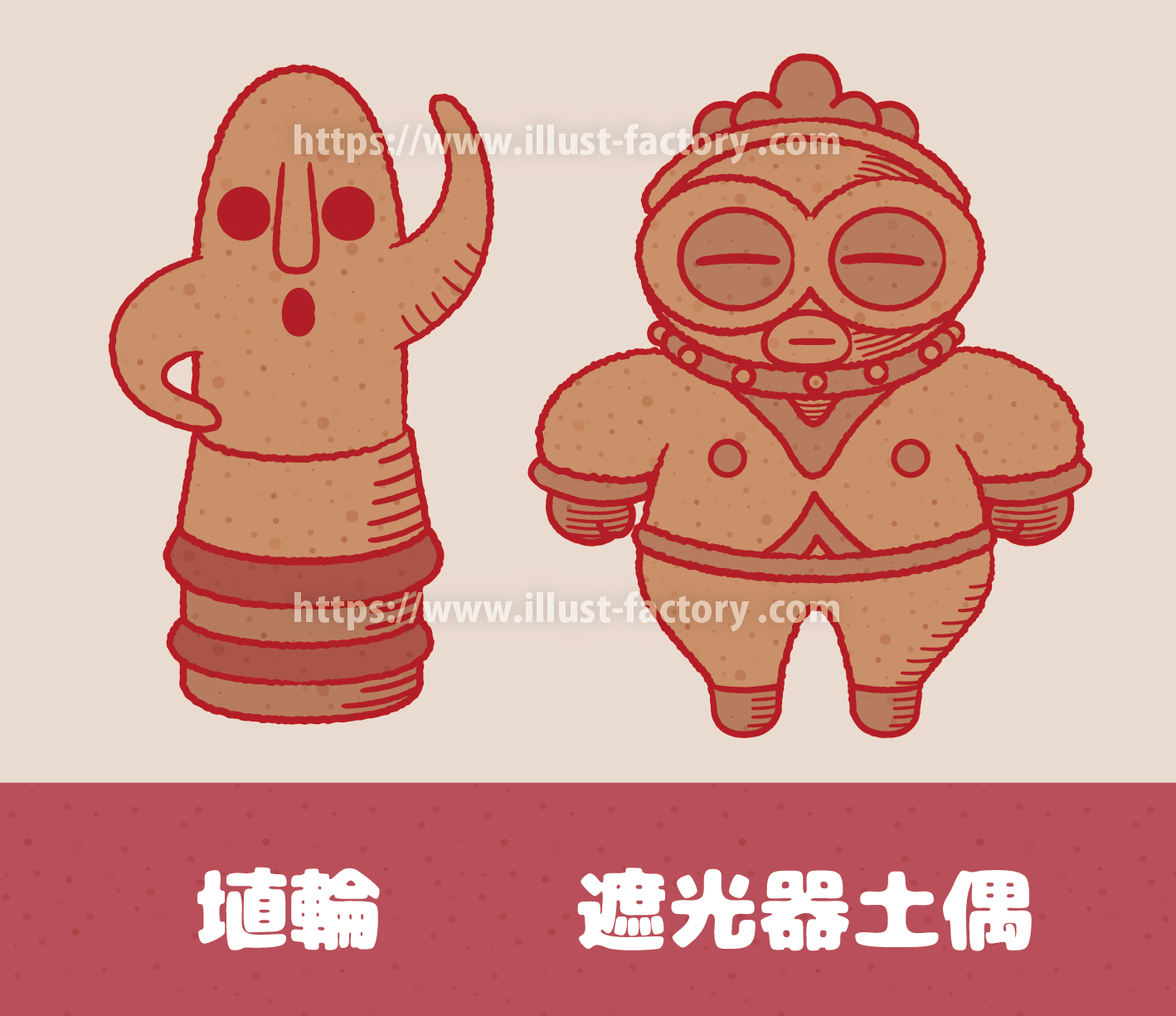 埴輪のイラストと遮光器土偶のイラスト制作例です。ざらっとした表面の質感を加えたシンプルな埴輪・土偶のイラストです。 埴輪の種類は豊富で、今回は埴輪の兵士、埴輪の馬、埴輪の家などをイラスト化しています。 今回は埴輪と土偶ですが、石や砂浜などのざらざらとした質感の表現も可能です。 墓石や自然の風景に溶け込む石などの制作もお任せください。