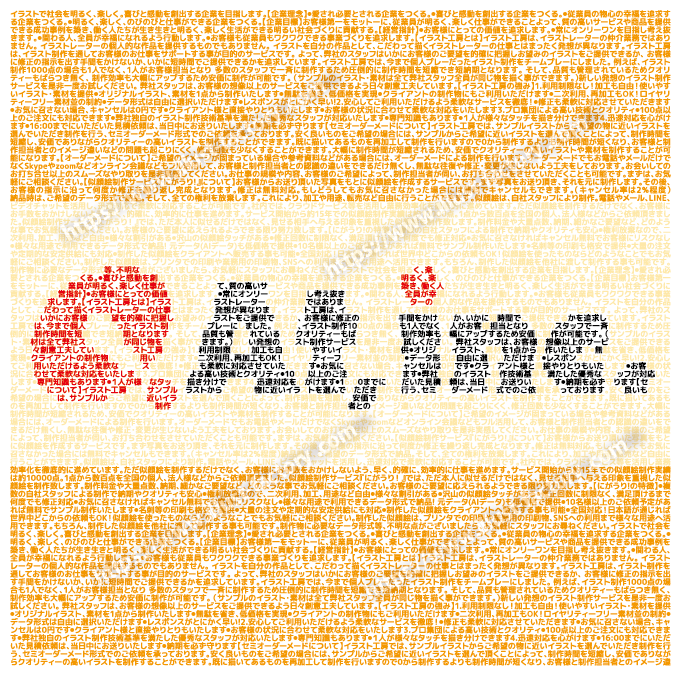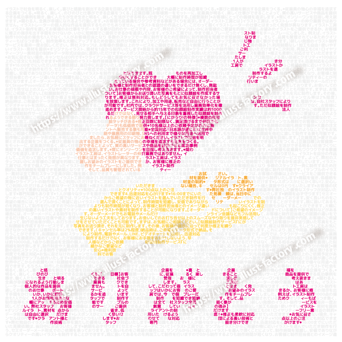 単語やメッセージで構成する「文字モザイクアート」のイラスト制作例です。サンプルD27のモザイクアートとは違って、途切れることなくタイピングした文字に色をつけることで表現したいイラストを描くタイプのモザイクアートになります。サンプルでは会社PR文を使用し、アットのロゴマーク・イラ猫・ハートのイラストマークを描きました。このようにたくさんの文字を使用したい場合、制作費用を抑えたい場合など文字列を利用したモザイクアートの表現方法が有効的です。