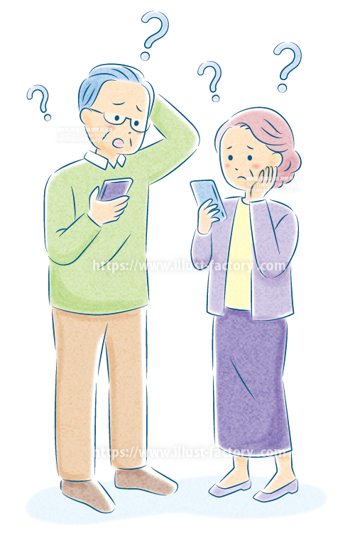 色鉛筆タッチ スマホを使う高齢者夫婦のイラスト制作例 G602