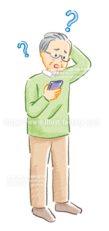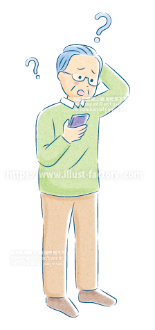 色鉛筆タッチ スマホを使う高齢男性のイラスト制作例 G602 スマホを手に持って困っているシニア男性
