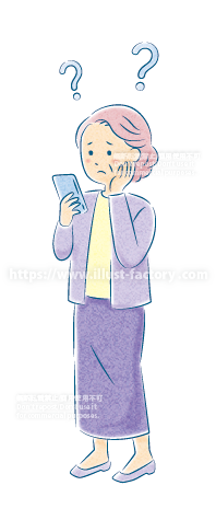 色鉛筆タッチ スマホを使う高齢者女性のイラスト制作例 G602 スマホを持って困っているシニア女性