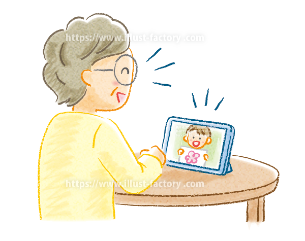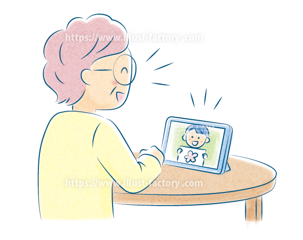 色鉛筆タッチ 孫とビデオ通話するシニア女性のイラスト制作例 G602