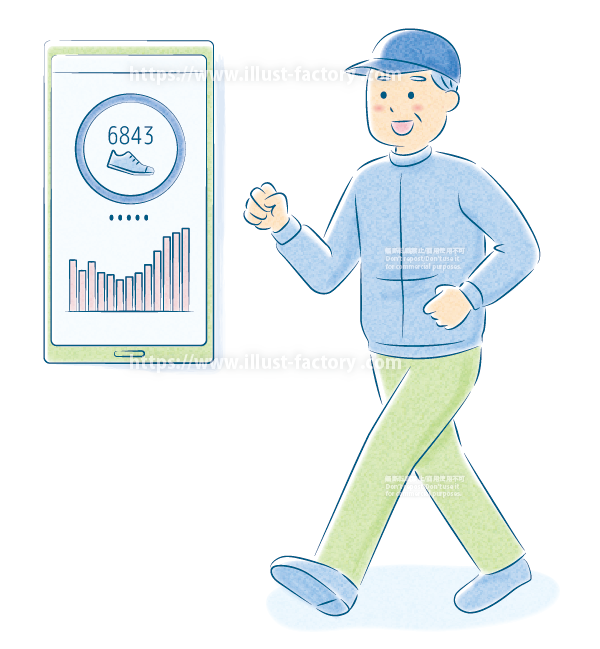 色鉛筆タッチ スマホを使って健康管理をする高齢男性のイラスト制作例 G602