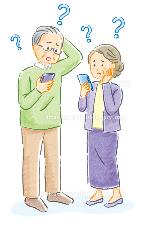 色鉛筆タッチ スマホを使う高齢者夫婦のイラスト制作例 スマホを手に持ち困っている様子のシニア世代の男女のイラスト